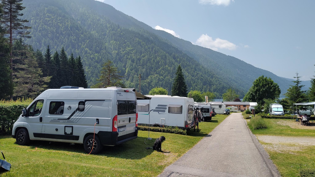Der Platz am Ostufer ist nur über eine lange, enge Straße erreichbar, keinerlei Durchgangsverkehr. Am ganzen östlichen 2/3 des 12km langen Sees gibt es keine Straßen und keine Bebauung. Es wirkt wie ein Fjord!